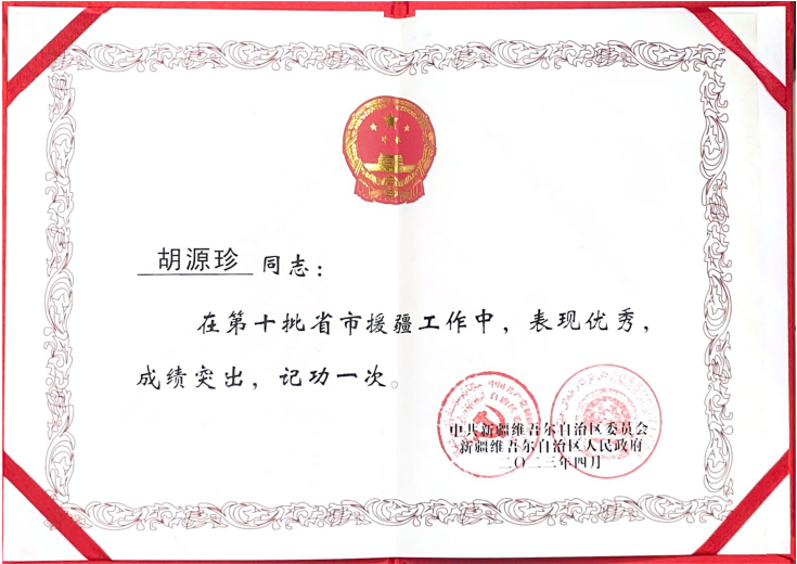 近日,我校SJB世俱杯官方网站胡源珍教师被中共新疆维吾尔自治区委员会、新疆维吾尔自治区人民政府评为“第十批省市优秀援疆干部人才”,因在援疆工作中表现优秀、成绩突出,记功一次。