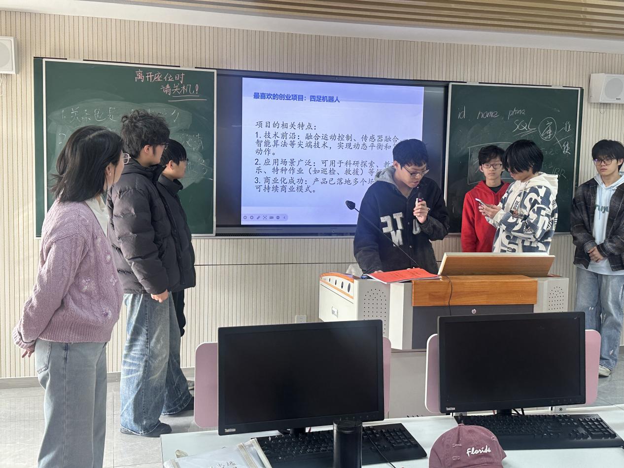 《大学生创业与创新教育》公开课由学院党委副书记朱阳瑾主讲,聚焦“创业团队管理”主题,注重培养学生的创新意识和家国情怀。课程中通过引入国内四足机器人领域领军企业“宇树科技”案例,引导学生分析讨论,激发他们的创新热情和社会责任感。学生分组研讨创业项目,不仅锻炼了创新思维和团队协作能力,还深刻体会到了创业过程中的责任与担当。