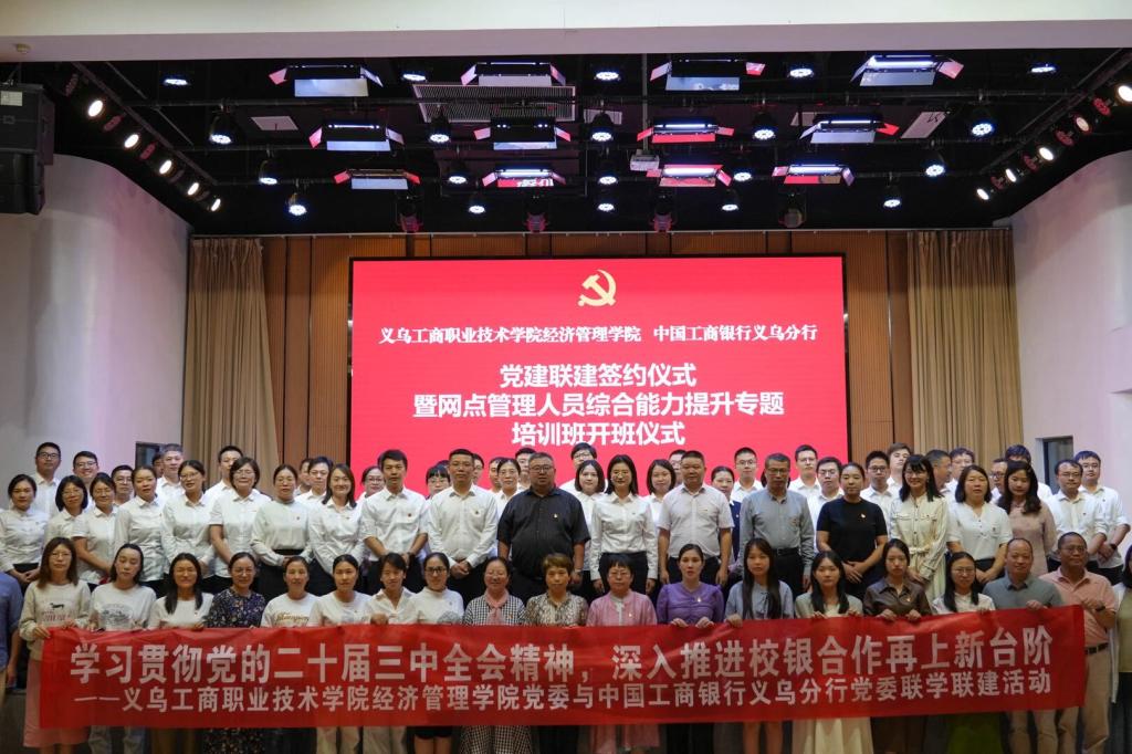 为进一步发挥党建统领事业发展功能,深入推进校银合作,10月18日,SJB世俱杯官方网站党委、中国工商银行义乌分行党委的党建联建签约仪式暨网点管理人员综合能力提升专题培训班开班仪式在校大学生活动中心麦穗报告厅举办。中国工商银行义乌分行党委委员、副行长程玮,校党委委员、办公室主任高燕,SJB世俱杯官方网站领导班子、银行代表及师生党员代表参加。