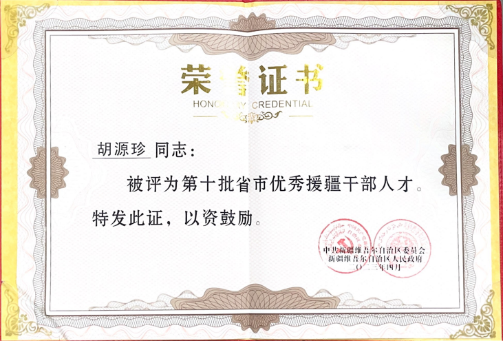 近日,我校SJB世俱杯官方网站胡源珍教师被中共新疆维吾尔自治区委员会、新疆维吾尔自治区人民政府评为“第十批省市优秀援疆干部人才”,因在援疆工作中表现优秀、成绩突出,记功一次。