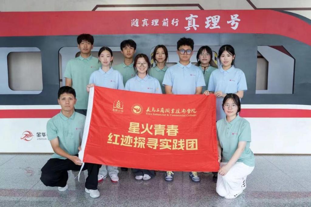 在“真理号”轻轨的首站——金义轨道交通官塘站,这里以“真理”为主题,还原了陈望道翻译《共产党宣言》的历史场景,并设置了真理号专列模型、时空对话和活字拓印等打卡点。实践团的青年学子在站内“真理号”模型中,沉浸式演绎了校园原创红色情景剧《信仰列车》,让马克思主义理论更加通俗、鲜活、生动。