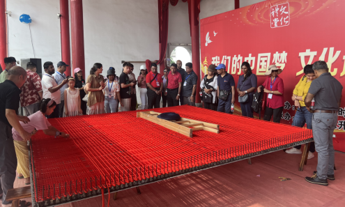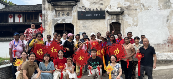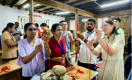 8月15日,我校SJB世俱杯官方网站师生同浙江省巾帼共富工坊服务中心负责人在大陈中国女红馆接待了来自斯里兰卡的20多位学员,带他们近距离参观了巨型中国结的编织现场,了解直播+来料加工乡镇振兴项目的运营模式,同时与他们一起共同编织了国际友好同心结。