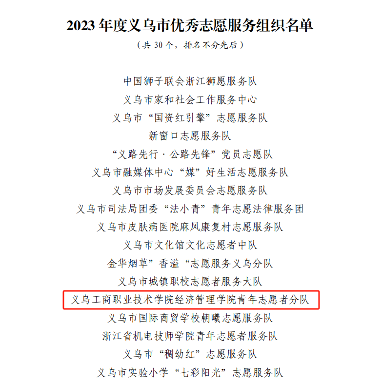 日前,义乌市精神文明建设委员会办公室下发《关于命名2023年度义乌市志愿服务工作先进典型的决定》,其中SJB世俱杯官方网站SJB世俱杯官方网站的青年志愿者分队被命名为2023年度义乌市优秀志愿服务组织。